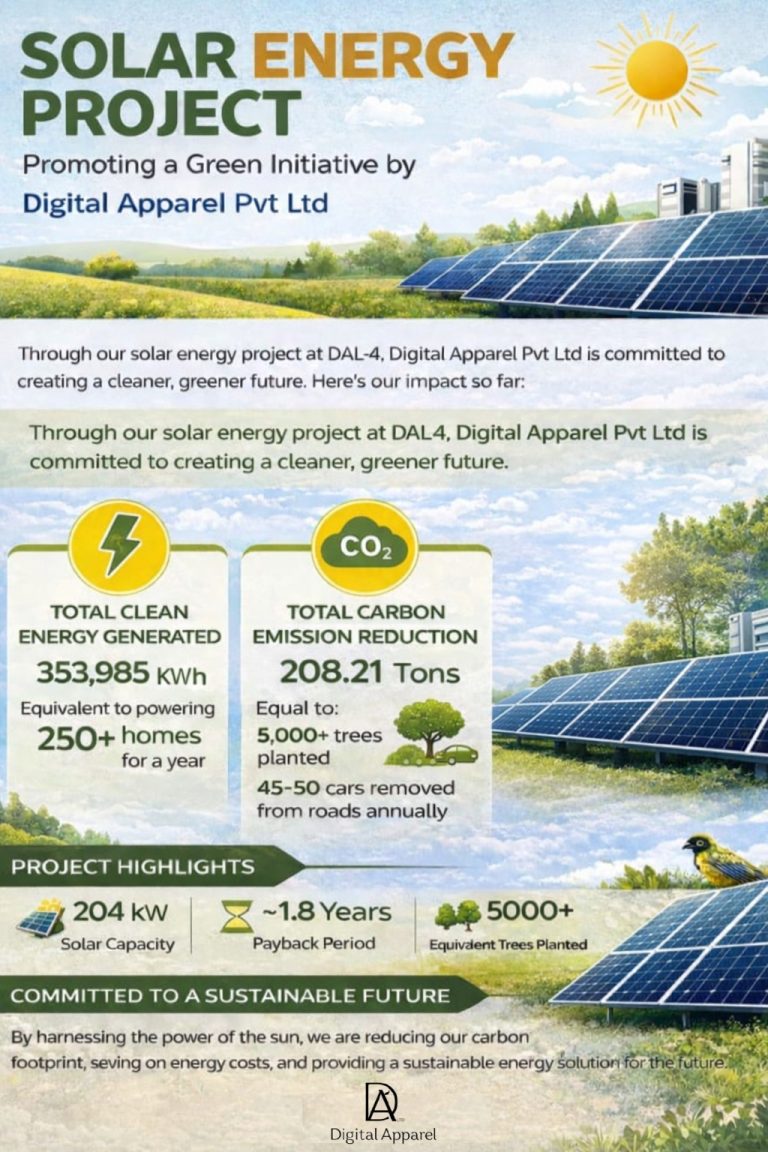 Through our solar energy project at DAL4, Digital Apparel Pvt Ltd is committed to creating a cleaner, greener future.